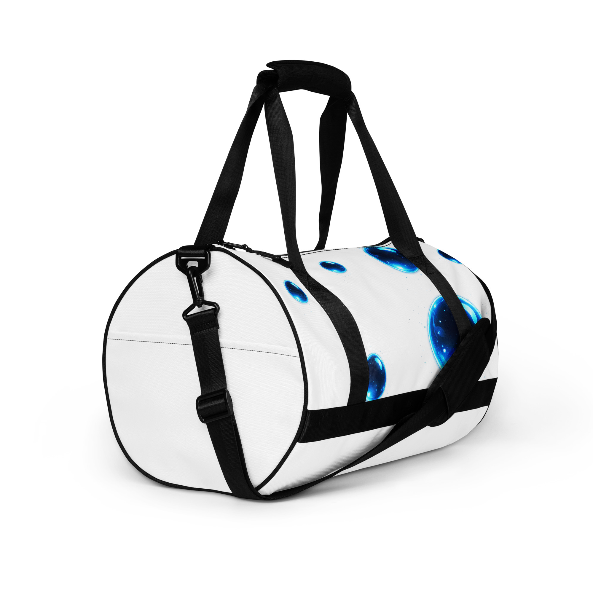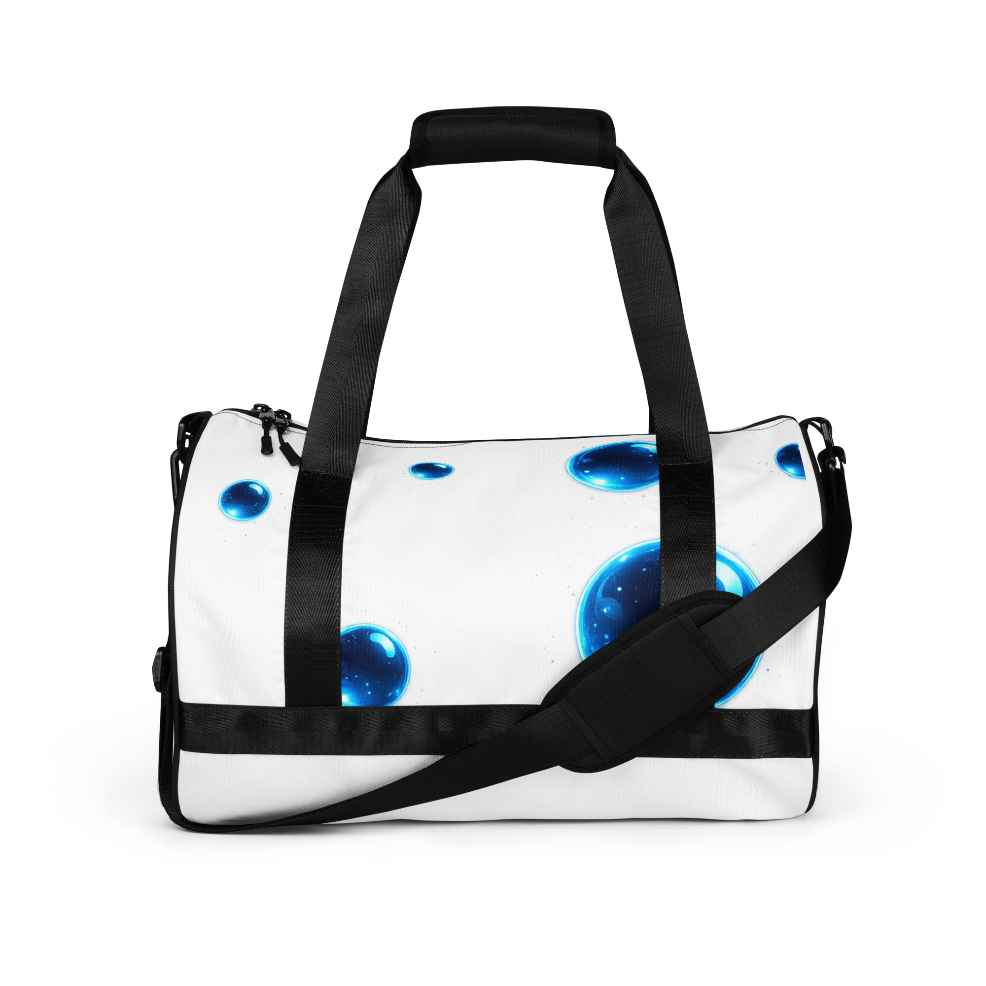Ready to get your fitness on? Add some punch to pumping iron with this all-over print gym bag. Made from 100% polyester and sturdy, water-resistant fabric, this bag is fun meets function. And it’s got pockets!