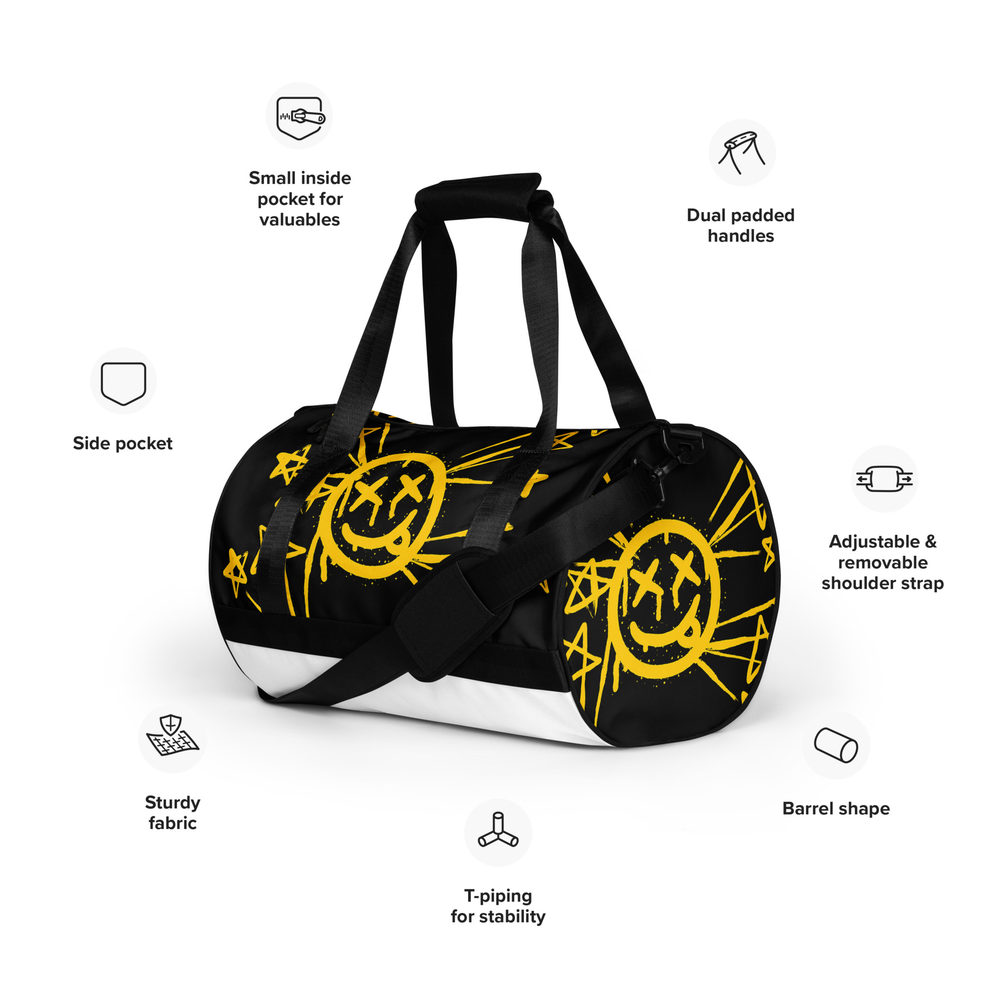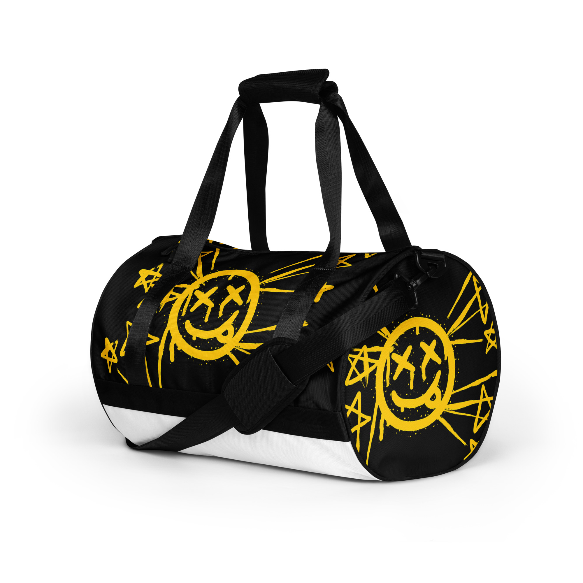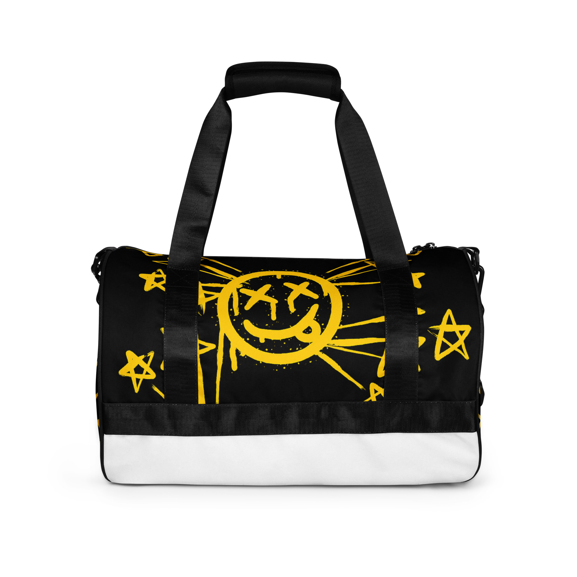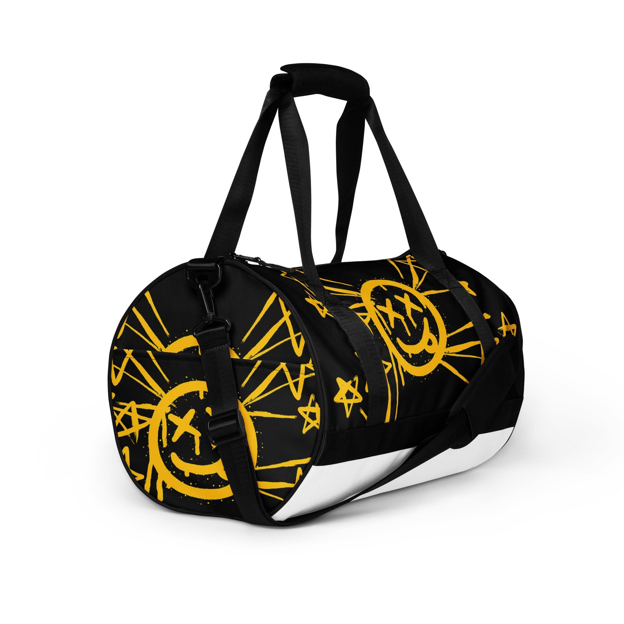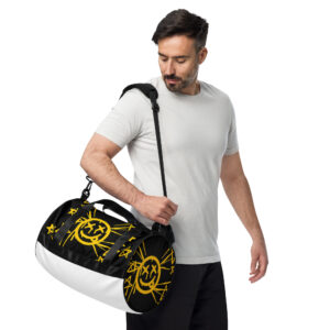 Ready to get your fitness on? Add some punch to pumping iron with this all-over print gym bag. Made from 100% polyester and sturdy, water-resistant fabric, this bag is fun meets function. And it’s got pockets!