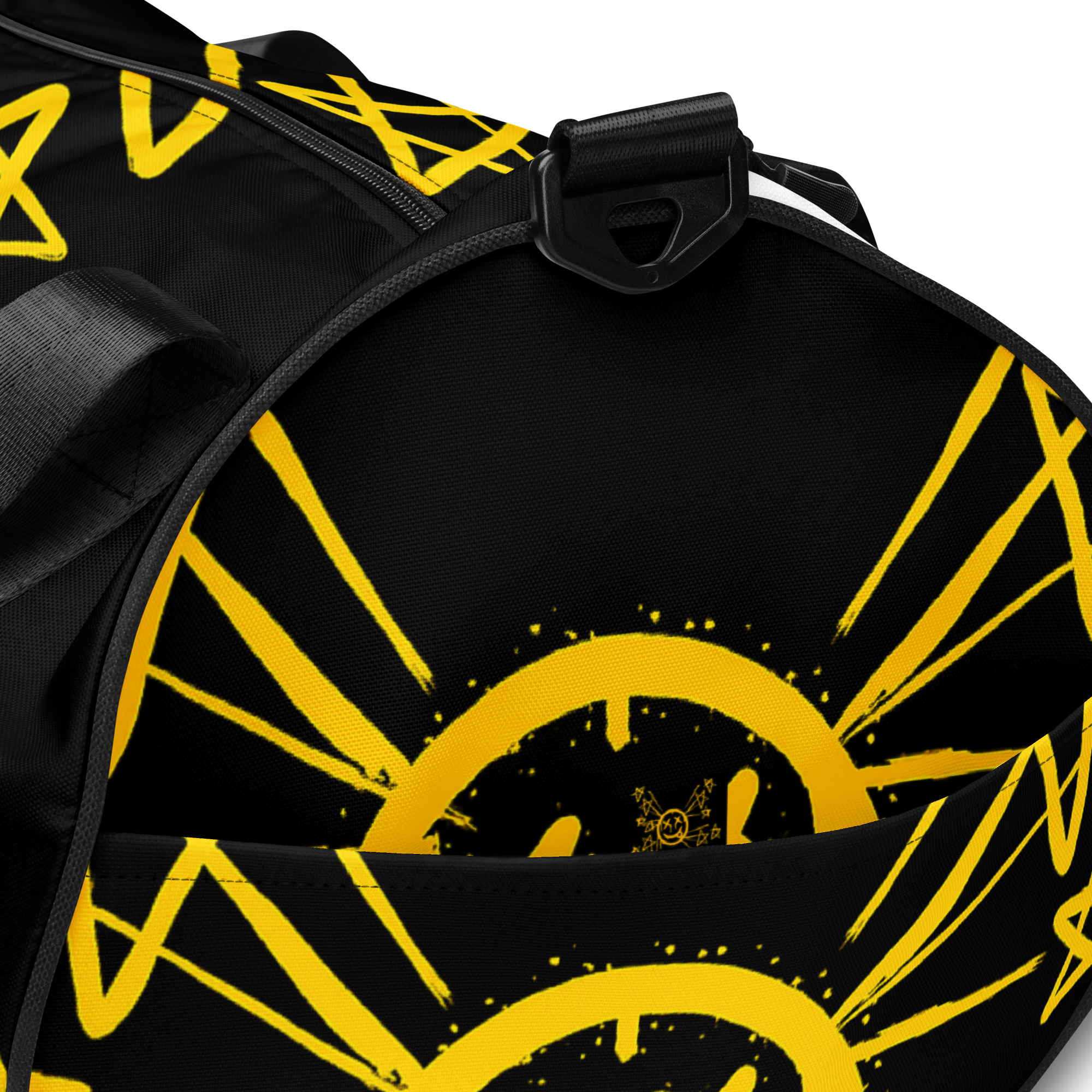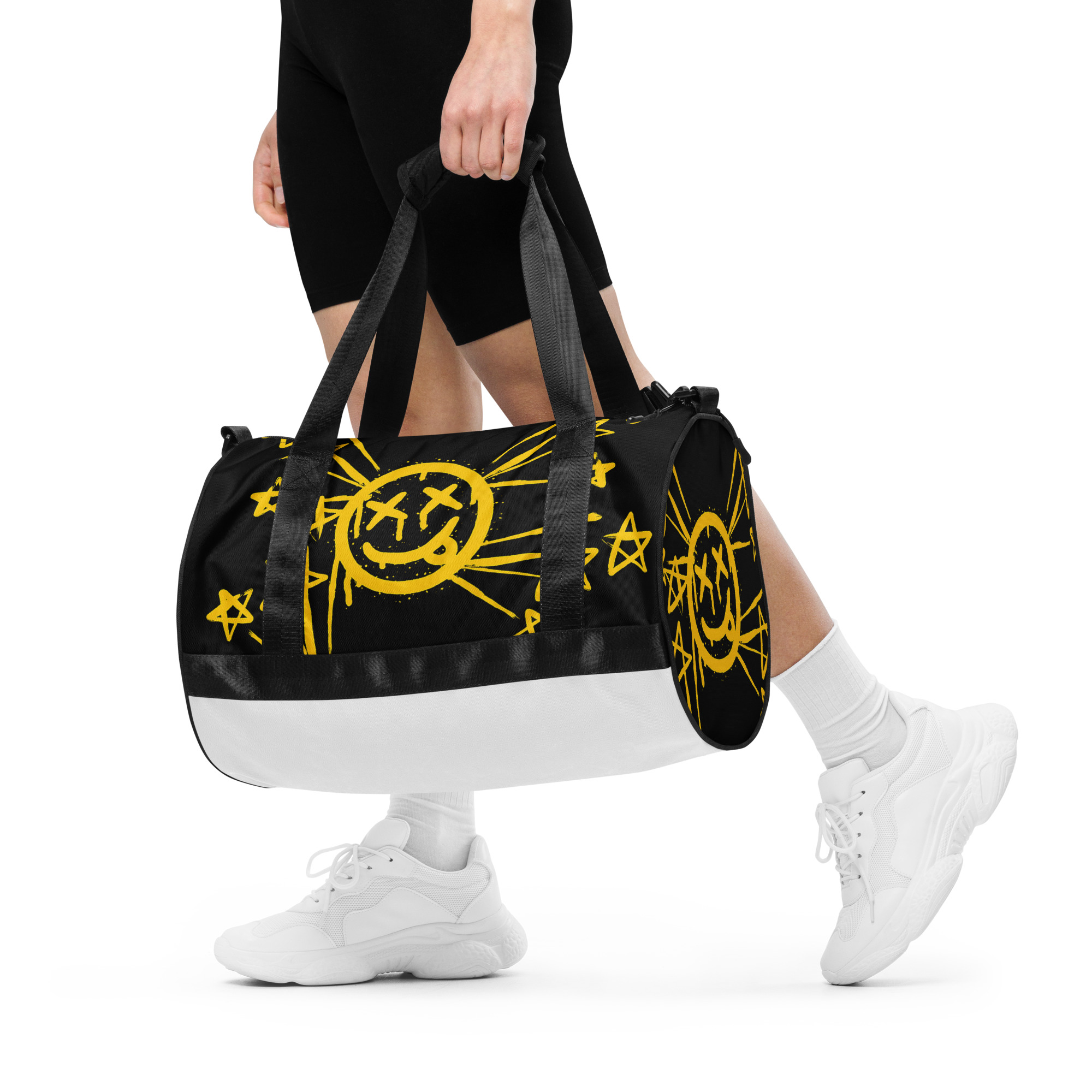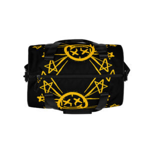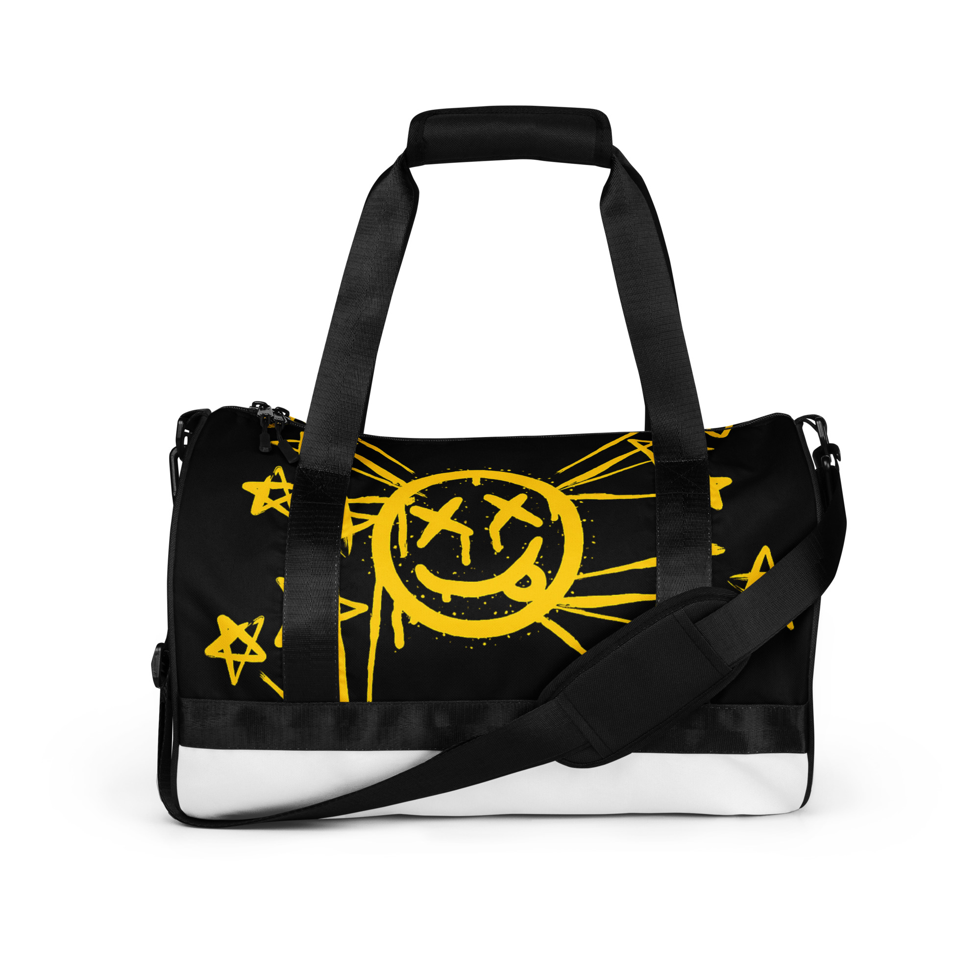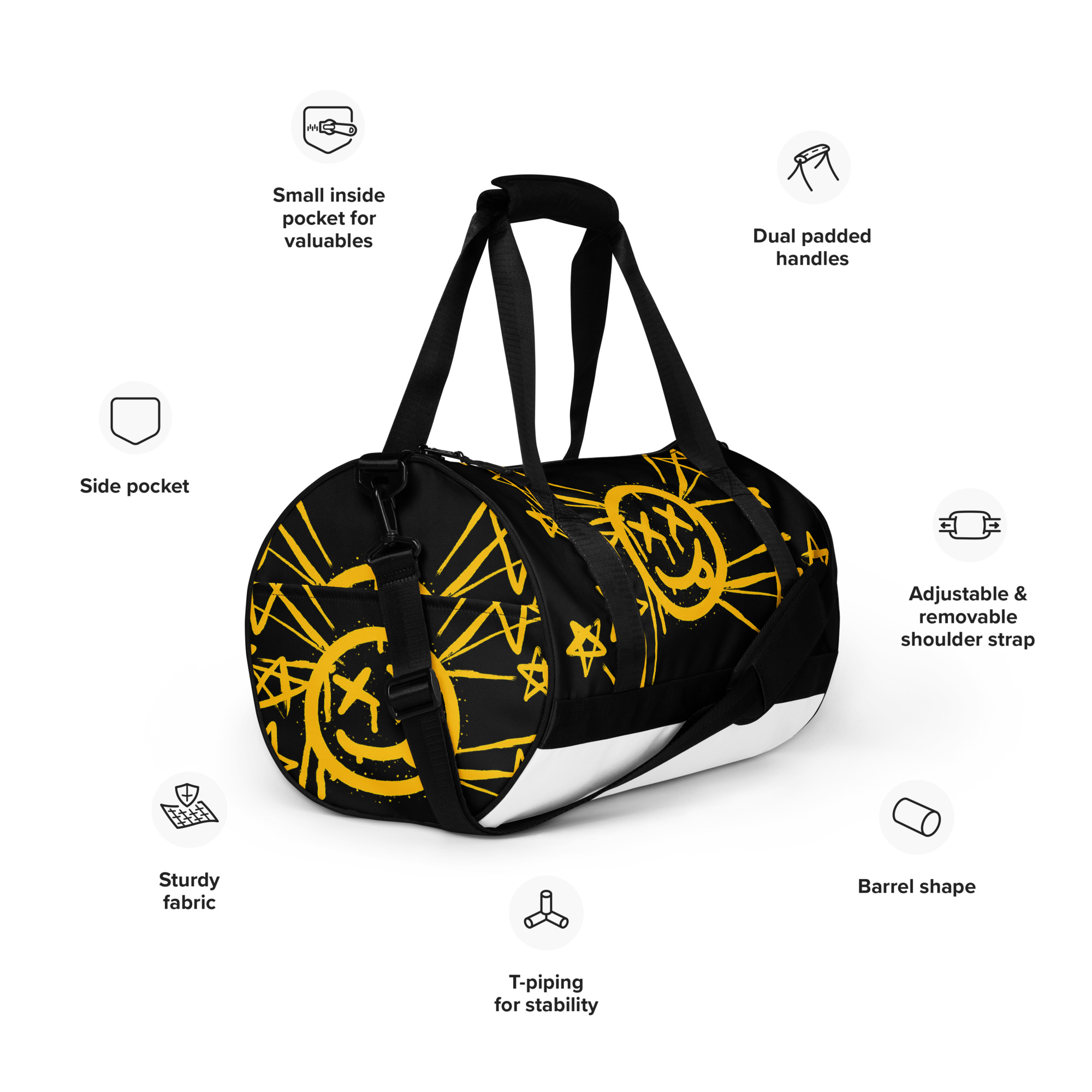 Ready to get your fitness on? Add some punch to pumping iron with this all-over print gym bag. Made from 100% polyester and sturdy, water-resistant fabric, this bag is fun meets function. And it’s got pockets!